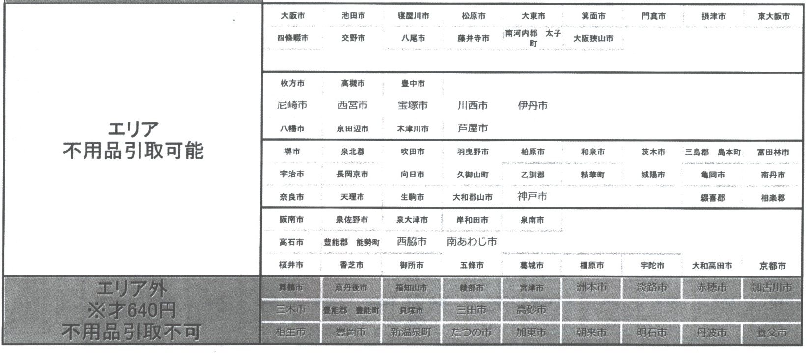 大川家具ドットコムの関西地区不要家具引き取り可能エリア表です。