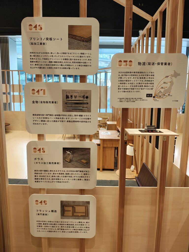 家具そのものだけでなく、木材選び・金物・ガラス・物流など、家具づくりを支えている裏側の展示もあって、「大川って、こうやって家具を作ってるんだな」と静かに伝わってくる感じ。