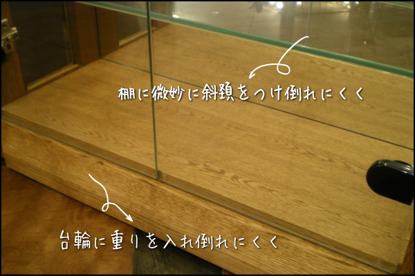 また、台輪を深くし、そこの部分におもりをつけて、奥行きが薄くても倒れにくくしています。