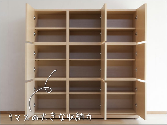このキャビネットは、縦3列、横3列の9つのマスで構成されています。