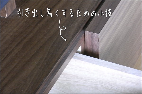 引出しの引っ掛かりを良くするため、本体の引き出し縁丈夫にヘコミを持たせています。